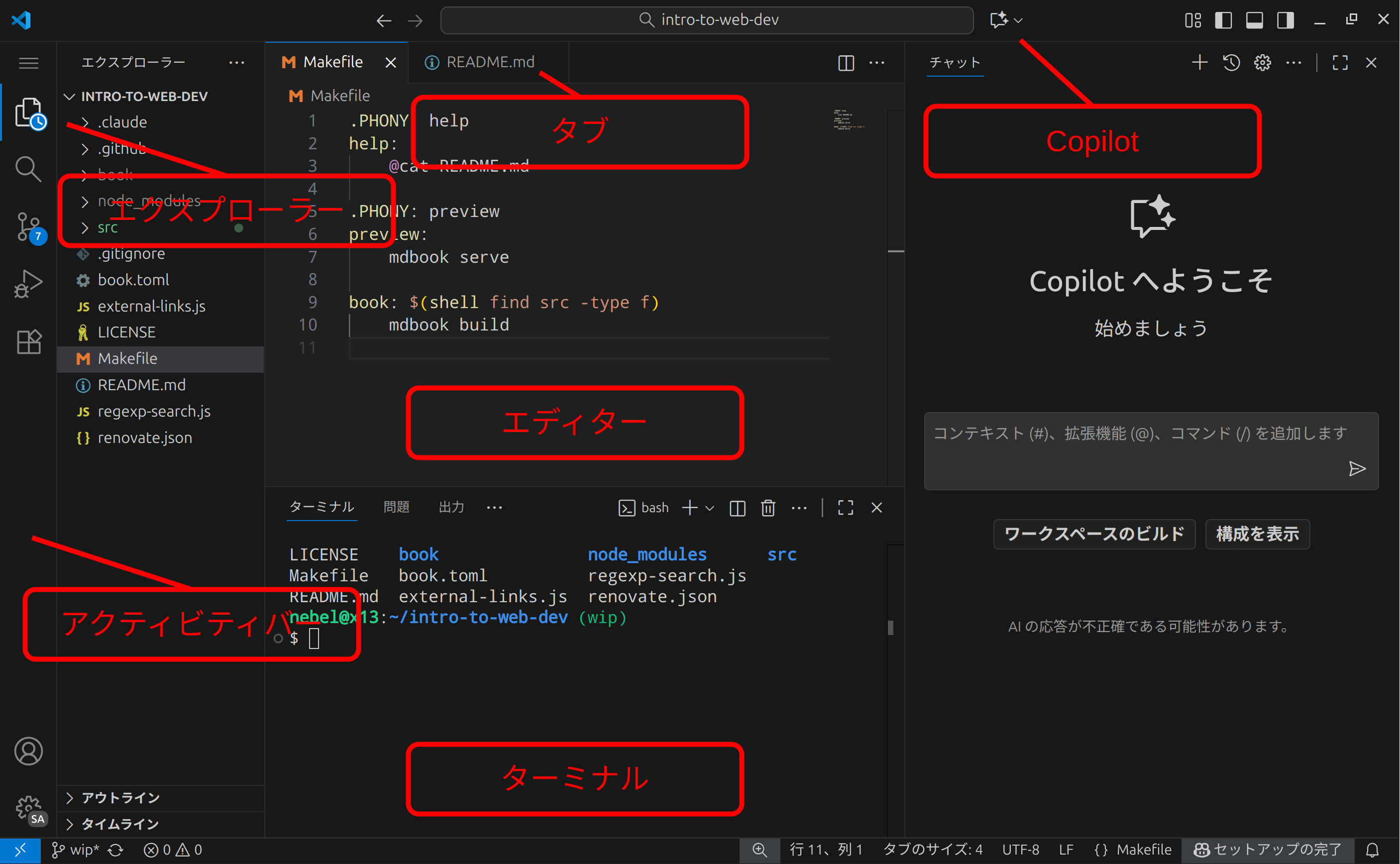 VS Codeの画面は、いくつかのエリアに分かれています。最初は覚えにくいかもしれませんが、慣れてしまえばとても使いやすいですよ。